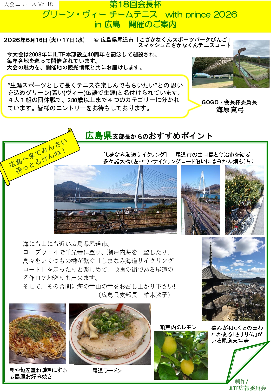 本部主催「会長杯グリーン・ヴィーチームテニス with prince 2026 in 広島」のご案内 要項を良くご覧いただき各自で申し込みをお願いします 申込書は、「2026本部主催の大会・その他」からお願いします 開催地 広島県尾道市 開催日 6月16日(火)・17日(水) 申込期日 4月7日(火)午前9時 ~ 4月14日(火)午後5時まで 申込方法 郵送のみ