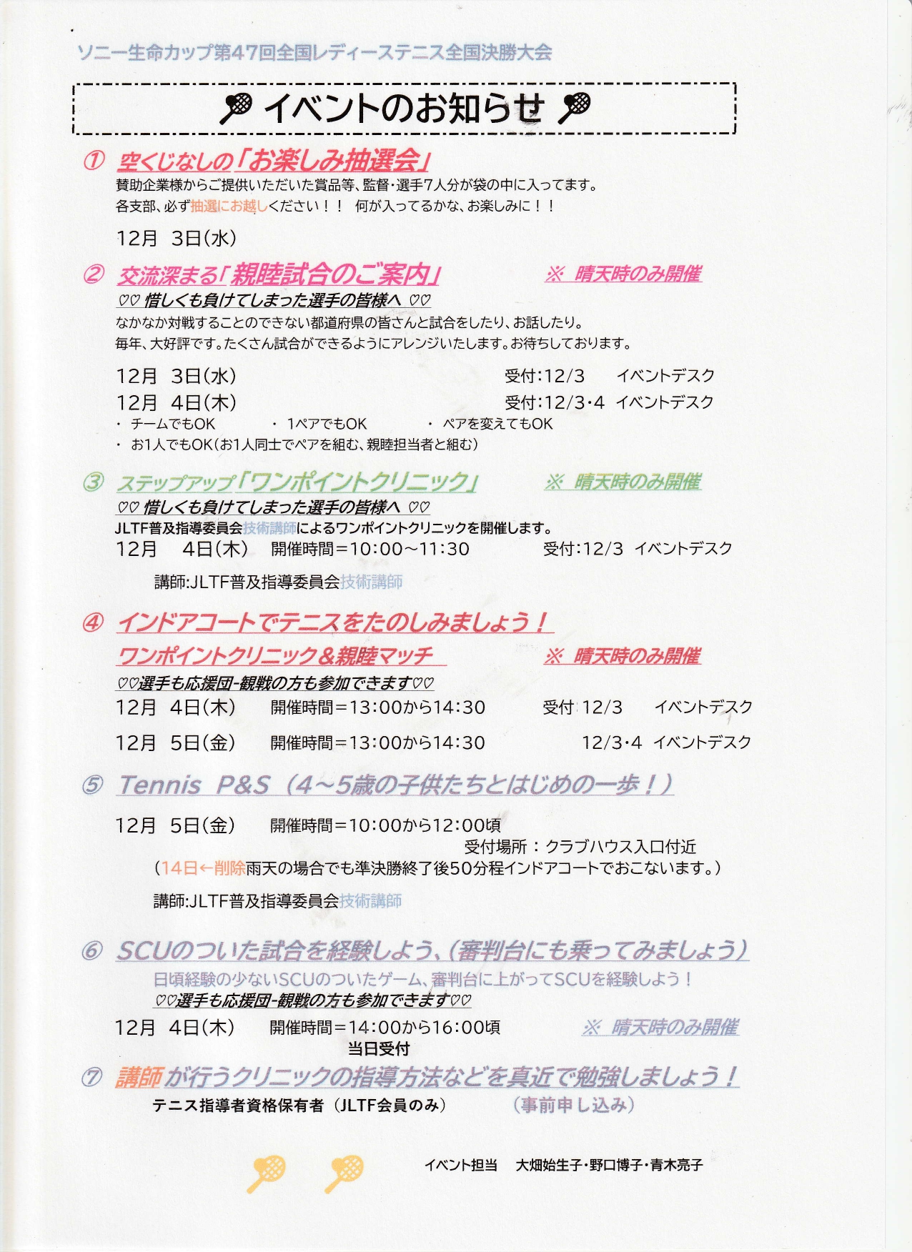 ソニー生命カップ第47回全国レディース全国決勝大会イベント案内 12月3日~5日の全国大会では屋外コートで試合が行われた場合、イベントの開催を予定しているそうです。応援団・観戦者が参加できるイベントもあります。有明テニスの森でテニスができる良いチャンスです。貸しラケットの準備もあるので、ぜひ参加してみてはいかがでしょうか?詳しくは以下の資料をご覧ください。