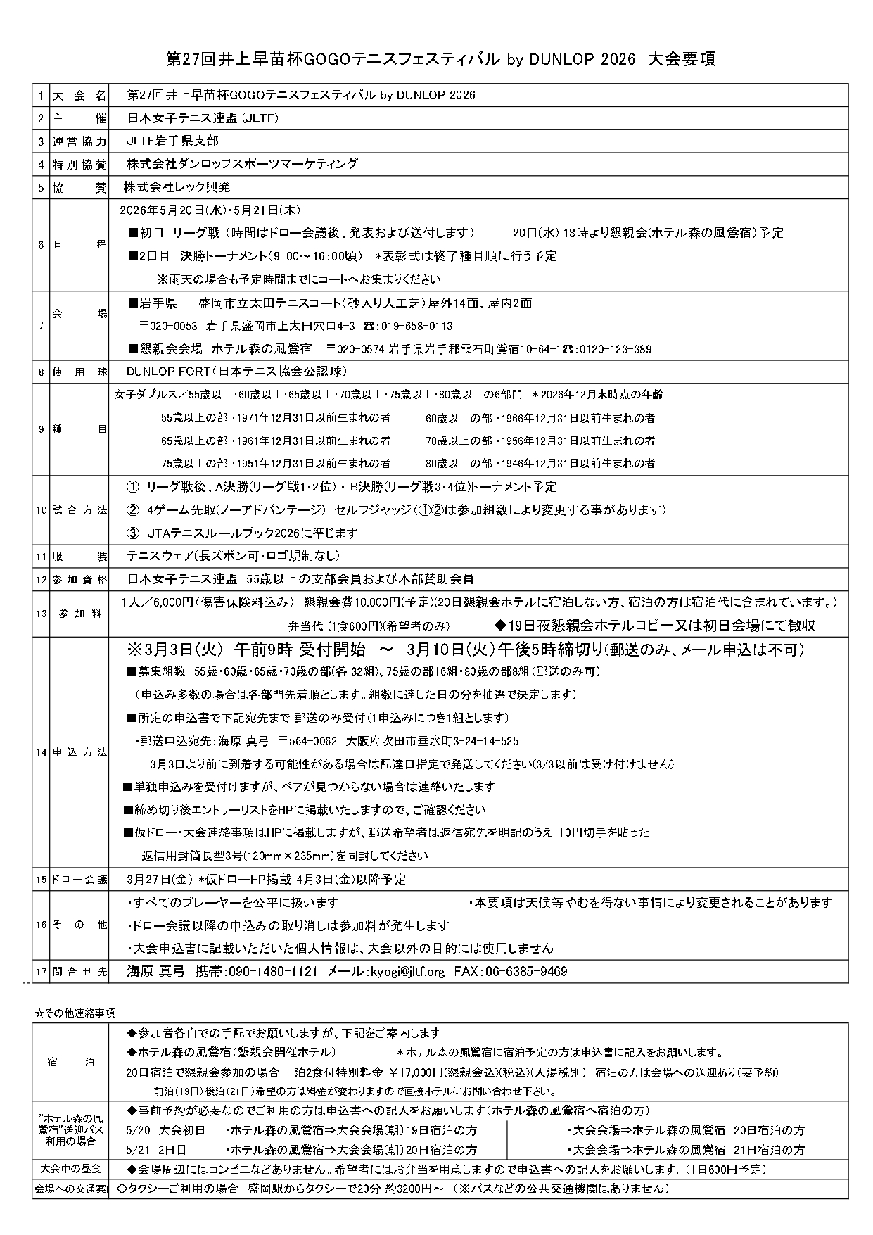 GOGOテニスフェスティバル by DUNLOP 2026 ㏌岩手のご案内 要項を良くご覧いただき各自での申し込みをお願いします 申込書は、2026本部主催の大会・その他からお願いします 開催日時 5月20日・21日(水・木) 開催地 岩手県盛岡市 申込期日 3月3日(火)午前9時 ~ 3月10日(火)午後5時まで 申込放送 郵送のみ(先着順ですのでお早めにお申し込みください)