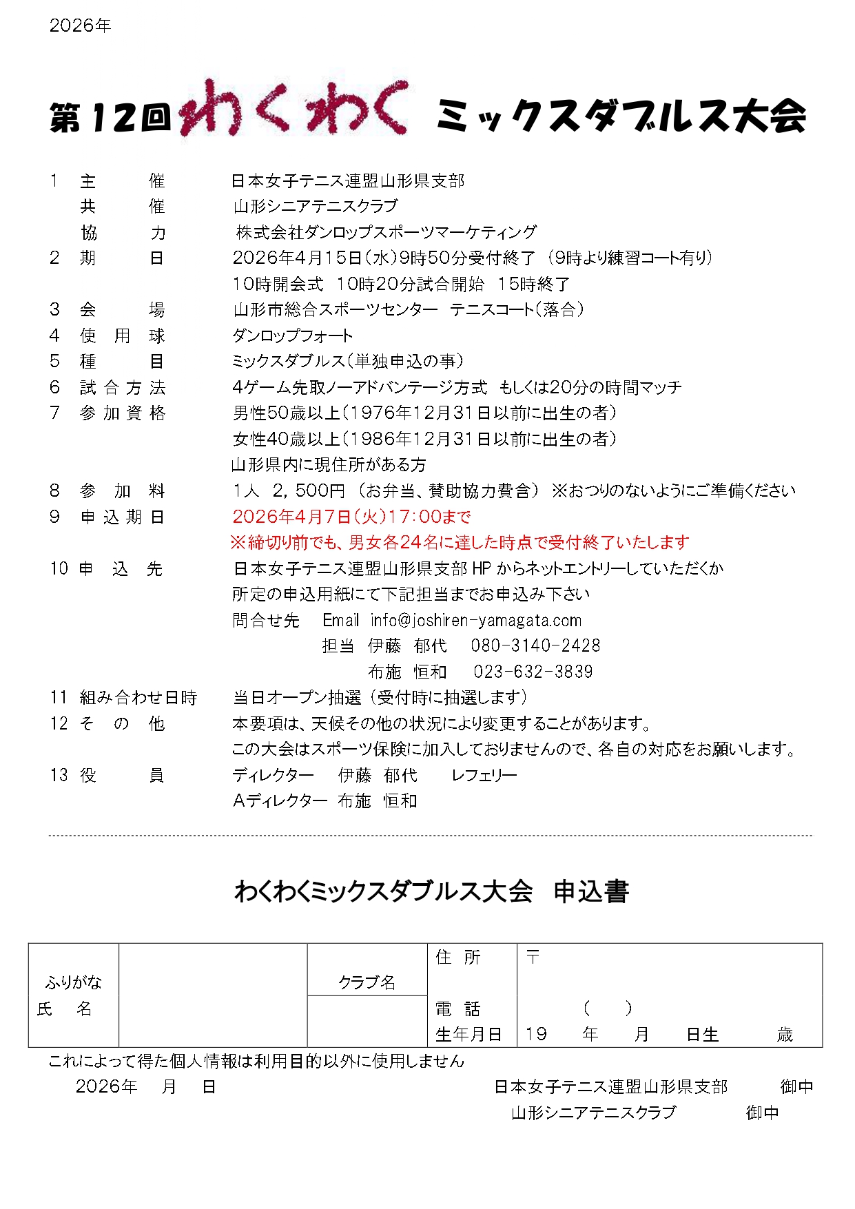 第12回わくわくミックス大会申込のお知らせ 12回わくわくミックス大会の申込は、ネットエントリーか、所定の申込用紙にて担当者にお申込み下さい。要項その他は【大会日程】からもご覧いただけます 申込期間は、3月15日(日)9時から4月7日(火)17時までとなりますのでよろしくお願いします。締め切り前でも、男女各24名に達した時点で受付終了いたします。 (ネットエントリーできても定員に達していた場合はお断りすることもあります。その時はご連絡いたします)